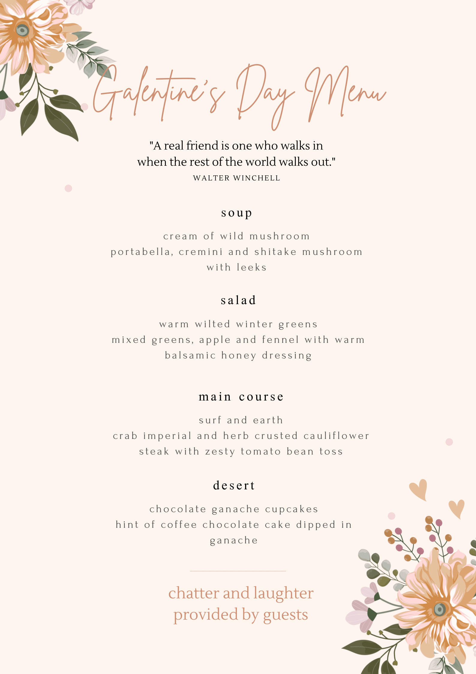 February 13th is Galentine's Day! The unofficial (made up) holiday started in 2010 based on an episode from the show Parks and Recreation. The main character, Leslie Knope invented the holiday to celebrate her closest girlfriends. To us, it’s a great excuse to invite your girlfriends over to enjoy some cocktails and a delicious meal. To get you started we put together a menu that you and your friends are sure to enjoy – it's even vegetarian friendly!